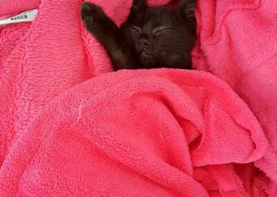 Geheel toevallig zagen onze vrijwilligers haar zitten, tussen de struiken vlakbij de opvang. Een sterk vermagerd poesje dat zo verzwakt was, dat ze stenen en rubber at! Ze was waarschijnlijk al een tijdje verdwaald. De eigenaar is niet gevonden, maar wel een fijn thuis. Ze gaat nu door het leven als Dirkje.