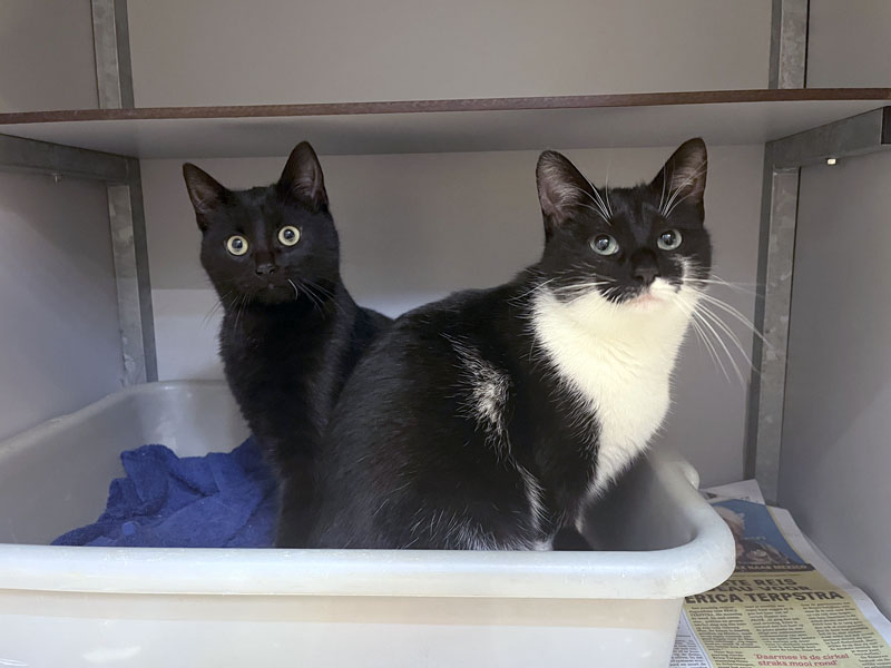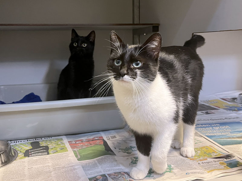 Moeder Maria (zwart-wit, 1 jaar) is gewoon een schat van een kat en haar kleine benjamin JeeCee (zwart, 5 maanden) evenzo. Vrede staat bovenaan en beiden zijn ze dol op knuffelen en stellen weinig eisen. Ze passen dan ook naadloos in elk huishouden.
